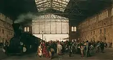After the "Anschluss" of Austria, Hermann Göring held propaganda speeches on 26 March 1938 and Adolf Hitler, Joseph Goebbels and other leading Nazi politicians on 9 April 1938, the day before the "referendum" on the integration of Austria into the German Reich, in the station hall.[28] The anti-Semitic exhibition "The Eternal Jew"[29] shown in the station was intended to legitimize the persecutions of Jews that had begun.