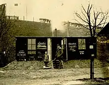 In the period up to 1914, the freight station was extended several times by the construction of tracks (a total of 51), magazines and transfer platforms. Some warehouses are still standing today. Incoming goods at the station were, for example, sea fish from the North Sea from 1899 onwards.[23] The Deutsche Dampffischerei-Gesellschaft Nordsee, which was founded in Bremen in 1896 and is still active today as a restaurant chain Nordsee, set itself the goal of supplying people in the inland with fresh fish in the fastest possible way, set up a fish shop. The North Sea ports were also used to transport the first tropical fruit, the bananas, to Vienna via the Northwest Station.[24] In the core area of the railway area were the forwarding agencies. Unloading and transhipment points for coal and wood, for example, were located on the edges. Companies of different sizes arose in the new development area of the 20th district, as new sources of economic income opened up with the railway traffic. For example, the delivery of milk from the surrounding area of Vienna led to the establishment of several milk processing plants such as NÖM.