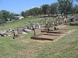 On 22 August 1894, Surveyor C. R. Scrivener completed a survey of two additions to the cemetery for a General Cemetery, with 1 rood 20 perches adjoining the Church of England Cemetery and another of 1 acre across the roadway.[16] On 4 July 1896, an area of 1 acre was dedicated as a General Cemetery on the opposite side of the unnamed road.[17] It appears to never have been used for interments.[1]