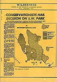 The society publishes the Wilderness Journal,[14] which covers a wide variety of stories about nature and people. Topics include the communities and forests of East Gippsland, a photo diary by Ben Baker of a road trip through bushfire damaged regions, a story about Marina DeBris and the ugly beauty of our trash, attempts to restore the giant kelp forests of Tasmania, and a journey into Mirning country, the coast and waters of the Great Australian Bight.