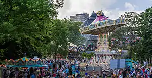 The Wilhelmstraßenfest is an annual street festival in Wiesbaden, Germany, which began in 1977 in celebration for the reopening of the Hessian state theatre. With roughly 250,000 visitors attending on the two festival days, it is the largest street festival in Germany. It takes place annually during the second weekend of June, on Friday and Saturday, on the namesake Wilhelmstraße and in the adjacent parks of Bowling Green and Warmer Damm. Its official name is "Theatrium." The name "Theatrium" is derived from then from "theater" and "Atrium" (Latin for "open air"). The festival offers the largest outdoor event in the city, a variety of culinary specialties, and many music show performances, up to seven large and small stages, rides, a craft market with 130 exhibitors, and a grand finale: a fireworks show.
