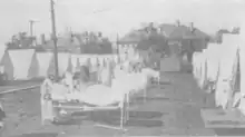 In 1918, Brooks sent letters urging for more hospital facilities, with the Spanish flu pandemic and injuries from the war placing a strain on the services.[95] As the pandemic worsened, he began devoting all his time to supervision of hospitals and studying the disease.[94] By September, Brooks, who had also been named a medical director for the United States Shipping Board, had established at Corey Hill an emergency tent hospital, believing through his studies that sunshine and fresh air were the most effective at combating the virus.[4][94] The Camp Brooks Open Air Hospital, as it was known, consisted of 13 tents, all but one of which were occupied by 1–2 patients and the other by the head nurse.[96] The hospital took 351 patients from the 1,200 sick among the merchant sailors in the East Boston harbor, receiving many of the worst cases.[96] A later article from the American Journal of Public Health described its conditions: