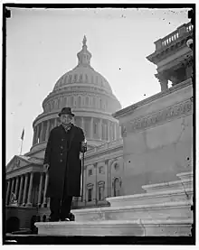 Apparently Pyle's column caught the attention of White House Press Secretary Stephen Early, who thought it might be a human-interest story that could generate positive publicity for FDR. Early "secretly" arranged for William Andrew Johnson to travel to Washington, D.C., to visit Roosevelt at the White House, and then "leaked" the meeting to the press.[47] An U.S. Secret Service man (alternately described as a "G-man from Louisville, Kentucky") was sent to chaperone him and the two traveled by train to D.C.[42] "You know, my folks used to live here," Johnson told a Knoxville reporter tagging along.[17] Roosevelt conversed with Johnson for half an hour in the Oval Office[42] and/or the Red Room.[26] Per Johnson, "He wanted to know all about my white folks—that was President Johnson and his family. I brought him all the pictures I had of Mr. Johnson, and his granddaughter Mrs. Margaret Patterson, and my sister, who was a slave in his family, too."[42] At the end of the meeting, Roosevelt presented Johnson with a silver-handled cane engraved with both their names.[42] Johnson was then taken on a Secret Service-chaperoned tour of the U.S. Capitol, where he was introduced to Vice President John Nance Garner, the Washington Monument,[2] the Lincoln Memorial, Arlington National Cemetery (including the Tomb of the Unknown Soldier), and Mount Vernon.[42] He may have also been interviewed for the radio.[26] Johnson called the visit with FDR and the trip generally "the finest thing that's ever happened."[42] Later in the year Johnson told a reporter, "When I called on Mr. Roosevelt in Washington I hadn't been to the White House in 62 years. I told Mr. Roosevelt that his makeup was more like President Johnson's than any man I had ever seen. They were both grand men, and they both talked so nice and grand to me."[41] Pyle said his role in prompting the meeting was the "happiest I've ever inadvertently made anybody."[17]