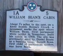 - ↑ "William Bean's Cabin - 1A5 | Tennessee Historical sign". waymarking.com. Retrieved May 14, 2015.