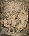 There are twelve plates in each of the Paradise Lost sets, one for each of the books in the poem. While some of these, such as Satan, Sin and Death: Satan Comes to the Gates of Hell, depict specific scenes from the epic; others, such as Satan Watching the Endearments of Adam and Eve, are syntheses of several scenes.[1] In the latter case, Blake employed visual barriers to separate the elements from different scenes, such as the arc of the bower in Satan Watching the Endearments of Adam and Eve.[2]