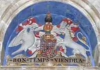 A 1599 escutcheon in Weare Giffard Hall (about 8 miles south-west of Tawstock), then a seat of the Fortescue family, displays the arms of William Bourchier, 3rd Earl of Bath, with another two showing the Royal arms and those of Edward Russell, 3rd Earl of Bedford, Custos Rotulorum of Devon.[lower-alpha 3]