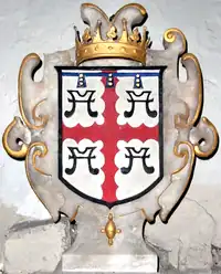 - ↑ These 10 quarterings are also visible in stained glass in the cloister of Hengrave Hall, Suffolk: Bourchier, Louvaine, FitzWarin, Audley, Cogan, Hankford, Stapledon, Martin, Dinham, Arches, all impaling Donnington (Argent, three pallets azure on a chief gules three bezants), the third wife of the 2nd Earl.[1]