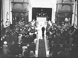 The new chancel made room for a robed choir, and eucharistic vestments.[2] Pictorial stained glass windows were ordered from England from Percy Bacon Brothers. All these changes, and the Anglo-Catholic style of worship adopted at St James', were in direct conflict with the Evangelical ideals and Low Church practices that were increasingly prevalent in the Sydney Diocese.[3] People came from the Sydney's suburbs "by tram and ferry" to enjoy the style of worship provided by St James' King Street.[3]