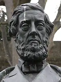 A bronze statue was made of the Earl by the Exeter sculptor Edward Bowring Stephens[5] and in October 1880 [6] was erected at the front of the central garden in Bedford Circus, Exeter, on the spot where Stephens' "The Deer Stalker" had formerly stood. (The latter statue now stands near the Earl's statue, both having been re-located in Northernhay Gardens). The unveiling ceremony was attended by Sir Stafford Northcote (1818-1887), later Lord Lieutenant of Devon 1886–7, (whose own statue in Northernhay Gardens now stands nearby) with the Mayor and Corporation, other dignitaries and the Earl himself. The statue was paid for by public subscription to the Devon Statue Fund, which had attracted 1,300 signatories for this work. A banquet was held following the unveiling ceremony. The plinth is of Cornish granite from the Cheesewring Quarries, on the rear of which a bronze plaque is affixed inscribed with verse from Wordsworth's Happy Warrior: