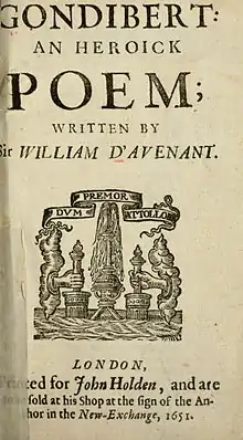- 1650: A Discourse upon Gondibert, an heroick poem (or simply Gondibert), originally published unfinished, then published again in 1651 in its final form and included Davenant's "Preface to his most honour’d friend Mr. Hobs" and "The Answer of Mr. Hobbes to Sir William D’Avenant’s Preface before Gondibert" by Thomas Hobbes, to whom the book was dedicated; the official second edition in 1653 also contained "Certain Verses, written by severall of the author’s friends"