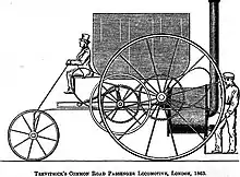 Richard Trevithick's 1803 London Steam Carriage was the first steam-powered vehicle designed for transporting passengers around London, but was never a commercial success. The carriage was carried by ship from Falmouth to London and arrived at Felton’s carriage works in Leather Lane in April 1803. Felton constructed the body, designed to accommodate eight people. The driver steered the front wheel using a tiller, with the engineman on a low step behind the coach. In July 1803 it was driven for some ten miles to Paddington then back through Islington with 8 passengers, and as a precaution streets were closed to other vehicles. On one of the vehicle's test runs it tore down 7 yards of garden railing, causing London's first motor accident.[3]