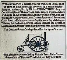 "William FELTON’s carriage works was close to this spot. In 1803 he built a carriage powered by a steam engine designed and supplied by Richard TREVITHICK, the great Cornish engineer. The carriage made several trips from here with up to about 8 passengers. In July of that year, one trip was made via Greys Inn Lane, Dorset Square and Tottenham Court Road to Paddington, returning the same day via Islington. This was the first self-powered vehicle to run in the streets of London and the world’s first self-powered road people carrier. The London Steam Carriage heralded the age of the car. This plaque was unveiled by Francis Trevithick Okuno, descendant of Richard Trevithick, on July 6th 2003”.