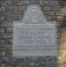 Premises in Brighton's Middle Street where Friese-Greene had a workshop for several years are often wrongly described as his home. They bear a plaque in a 1924 design by Eric Gill commemorating Friese-Greene's achievements, wrongly stating that it is the place where he invented cinematography. The plaque was unveiled by Michael Redgrave, who had appeared in The Magic Box, in September 1951. A modern office building a few yards away is named Friese-Greene House. Other plaques include the 1930s Odeon Cinema in Kings Road, Chelsea, London, with its iconic façade, which carries high upon it a large sculpted head-and-shoulders medallion of "William Friese-Greene" and his years of birth and death. There are busts of him at Pinewood Studios and Shepperton Studios.[31]