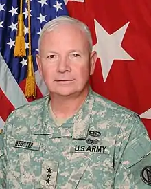 Lieutenant General William Glenn Webster (born July 3, 1951) is a retired senior officer in the United States Army and a former commander of the Third United States Army/United States Army Central.[1][3] Webster assumed command of the Third Army/Army Central on May 9, 2009 from Lieutenant General James J. Lovelace and during his tenure was responsible for moving the Third Army's headquarters from Fort McPherson, where it had resided for 62 years, to Shaw Air Force Base in 2011.[4] Webster was succeeded as commanding officer of the Third Army upon his retirement by Lieutenant General Vincent K. Brooks on June 3, 2011. While commanding Third Army, Webster oversaw the transition towards full-spectrum operations in the Third Army from a more narrow focus on combat operations as well as the Third Army's role in sustaining United States military activity in Iraq and Afghanistan.[1]