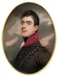 Davy was awarded the Field Officer's Gold Medal, a clasp, and a gold ribbon buckle for his service in the battles of Roleia, Vimiera and Talavera during the Peninsular War. He was also praised by distinguished figures, such as Secretary of State Lord Castlereagh.[4] Davy became a Companion of the Bath in June 1815. King William IV knighted Davy and made him a Knight Commander of the Royal Guelphic Order in 1836.[1][4]