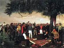After the siege of Bexar, Cooke volunteered for the Matamoros Expedition as captain of the San Antonio Grays[6] formed by those of the New Orleans Grays that did not remain in San Antonio. Arriving at Refugio they were ordered to San Patricio as reinforcements. When Colonel Grant announced his intentions to join the Mexican Federalists, Captain Cooke was ordered back to Goliad, from where he was sent with two prisoners-of-war to Washington on the Brazos. During the battle of San Jacinto, Cooke served as assistant inspector general with the rank of major[4] on Houston's staff.[7] After the battle, Major Cooke prevented the lynching of Santa Anna, thereby making it possible for Houston to negotiate peace and independence.[8]
