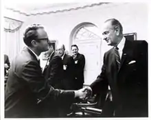 ![]() Gorham (left) and Lyndon B. Johnson at the Urban Institute dedication, 1968 | |
