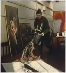 Through his fellow artist Tony Messenger, Green met the photographer and film-maker Ken Russell.[1] Russell made a series of photographs and the film that was to make Green's name. Green was seen making action paintings by hurling bitumen and paraffin at a primed sheet of board before cycling across the picture, skidding over it in plimsolls and finally scorching the surface with fire. Green became known around the world, attracting a level of attention that made him among the most talked-about artists in Britain. His working methods were lampooned by Tony Hancock in the film The Rebel (1961).[1]