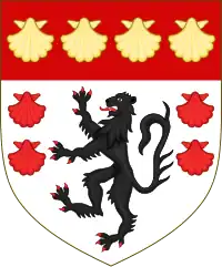 Argent a lion rampant Sable between four escallops Gules on a chief of the last as many escallops Or.