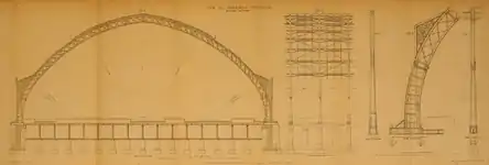 Between 1862 and 1869, Barlow was consultant engineer for the Midland Railway's southern extension from Bedford to London, including the layout of the London terminus station at St Pancras on Euston Road. To deal with the sloping site and the need to cross the Regent's Canal a short distance to the north, the platforms were constructed on a raised structure supported on cast iron columns and girders. Under this structure, storage was laid out for beer from the breweries at Burton upon Trent.[5] With assistance from Rowland Mason Ordish,[6] Barlow also designed the arched, cast iron station canopy which spans 240 feet (73 m) across the platforms without intermediate support – then the widest of its kind in the world. It was designed as a cost-effective and efficient means of avoiding the need for additional solid structure in the lower level.[7] George Gilbert Scott designed the hotel in front of the train shed.[6]