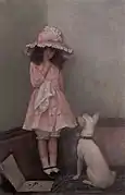 Gore was a Victorian genre painter of children and animals. Genre painting is a term that refers to the depiction of everyday life and was immensely popular in the late Victorian period. Gore’s painting of children and animals capture the excitement and playfulness of a Victorian child at play. They are affectionate and arresting but came to be seen by some critics as trite and sentimental.[12][2] Their reassessment took the best part of a century. The whereabouts of many of his genre paintings are unknown with some examples known only from photographs and sketches discovered at his studio in Newbury.[2] One of W.H.Gore’s most famous images is Forgive Us Our Trespasses exhibited at the Royal Academy in 1897. A little girl in a night-dress is kneeling against her bed saying her prayers. A small dog, possibly one of the terriers that Gore owned, is also kneeling seeking attention. It is an image that has been produced many times since in commercial settings. The West Berkshire Museum at Newbury in Gore’s home town owns two paintings A Pastoral Scene (1914) and The Culprit (1900), the latter an example of Gore’s genre painting of children.[13]