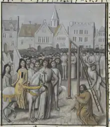 Hugonet came from a non-noble family from Mâcon, and was educated in law at the university. In 1455 he entered the service of Philip the Good. In 1467 he married Louise de Layé, who came from an aristocratic family in Beaujolais. After the death of Philip the Good, his son Charles the Bold became Duke of Burgundy. During his reign, the career of Hugonet was further advanced and in 1471 he was ennobled and promoted to chancellor, or head of the administration, of Burgundy. He acquired several titles and the lordship of Middelburg, as well as houses in Mechelen, Brussels and Bruges. Following the death of the Duke at the Battle of Nancy, Hugonet was imprisoned, and in April 1477 executed, by the citizens of Ghent, who blamed him for having reduced the independence and power of the urban elites during the reign of Charles the Bold.[1]