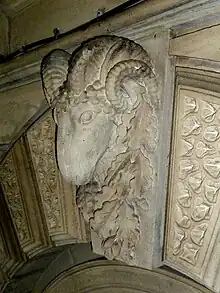 - Town Hall, Leeds, 1853–1858.[41] Foliage and ram's heads on front door panels, arch over front door tympanum, roof pinnacles, sheep on clock tower, Corinthian capitals.