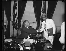 William J. Thompkins visits Franklin Roosevelt in his role as official of the Improved Benevolent and Protective Order of Elks of the World to invite Roosevelt to attend a parade, August 27, 1935.