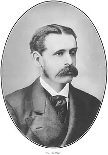 King studied civil engineering at Queen's College, Galway and at Queen's University before joining the Geological Survey of India on 4 March 1857. His first work was in southern India with H.F.Blanford. He then worked in central India and surveyed western Chota Nagpur and took over the position of director at Calcutta, succeeding Medlicott in 1887.[2] He was given six extensions from the normal age of retirement at 54 thus retiring at the age of 60 on 16 July 1894 after 37 years of service.[3] He was succeeded by Carl Griesbach as director as the next senior officer T.W.H. Hughes was injured, losing his eyesight and being forced to retire.[2][4]