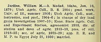 Jardine had a strong interest in practical farming. He was also attracted to the opportunities in education. He began his teaching in Utah, where he soon became professor of agronomy. In 1910, Jardine moved to Manhattan, Kansas, to accept the position of agronomist at the Kansas State Agricultural College. Three years later, Jardine was made dean of the Division of Agriculture and was Director of the Agriculture Experiment Station.