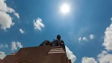 Rice's body was eventually cremated, and the urn of his ashes was kept in the vault of the business office of the Trustees of the Institute until it was deposited beneath the monument erected in his memory on the campus of the Institute.[2] In 1930, John Angel completed the Founder's Memorial at Rice University — depicting a seated William Marsh Rice — in line with specifications by architect Ralph Adams Cram.[8]
