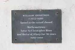 Oughtred therefore remained at Albury,[25] serving as rector there for fifty years.[26][27] William Lilly, that celebrated astrologer, knew Oughtred and claimed in his autobiography to have intervened on his behalf to prevent his ejection from his living by Parliament in 1646: