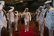 Commander, U.S. 7th Fleet Vice Adm. Bill Merz salutes side boys as he arrives at the Fleet Activities Yokosuka Theater for the 7th Fleet change of command.