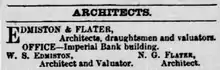 He relocated to the town of Edmonton in 1892, becoming the town's first architect. He also operated a brickyard upon settling.[7] In 1892, Edmiston, working independently at the time, was contracted by the Edmonton Town Council to draft a map of the town.[8] In that same year, he was also a member of a committee tasked with a project to establish a brewery in Edmonton.[9] In 1893, he established a partnership with local architect Nathaniel G. Flater, and operated under the name Edmiston & Flater, headquartered at the Edmonton Imperial Bank Building. The firm designed many notable buildings for the town, including the first post office,[10] the city's first brick school (for the Edmonton Public School District), the All Saints' Anglican Cathedral, a home for Herbert Charles Wilson, the McDougall & Secord retail store, and a fire hall.[11] In 1899, he would end his partnership with Flater and enter into a new one, with Henry D. Johnson of Calgary, under the firm name Edmiston & Johnson Architects, Draughtsmen, Valuators and Insurance Agents. This firm was responsible for constructing, amongst many, a hospital building, a new Presbyterian church and making alterations to the Robertson Hall Theatre.[12]