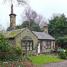 These are Grade II listed buildings on Skircoat Green Road, Halifax, West Yorkshire.[12] In enactment of the Will of woolstapler John Abbott (1796–1870),[149] twelve almshouses were built with a porter's lodge and walls and gates, all designed by Barber in 1876 at a total land-purchase and building cost of £17,880. The project was opened in January 1777.[150] It has three tall gate piers, two pairs of gates, stone walls and ornate iron railings. The lodge is in the same style as the homes, being built of coursed rubble with ashlar dressings, and with gables and mullioned windows. The homes have tall chimney stacks and slate roofs with ashlar coped gables and finials.[12][150] As of 2014 the charity was still functioning, providing accommodation for the elderly.[151][nb 16]