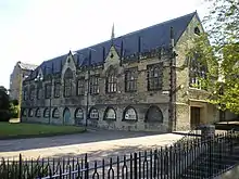 This is a Grade II listed building.[3] It was built in Upper Kirkgate, Halifax, as Halifax Parish Church Day School, and is also known as Causey Hall, or Church School, Upper Kirkgate.[3][4] It stands close to Halifax Parish Church (or Minster Church) of St John the Baptist which is in Dispensary Walk, Church Street, Halifax, West Yorkshire. It was designed by Mallinson & Barber as a Gothic Revival school for 805 children at a cost of £5,000 and opened on 10 June 1867. The ground floor was a covered playground, and it had two classrooms and a 130 feet (40 m) by 28 feet (8.5 m) school hall. The school closed in 1959, and the building became a church hall and verger's flat in 1962. As of 2007 it was to be restored at a cost of £140,000.[86][87][nb 3]