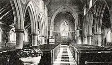 The church was built with a nave, chancel and north and south aisles. The nave and chancel together make a six-arch arcade, with a 22 feet (6.7 m) wide chancel arch. The west tower is 20 feet (6.1 m) square, with walls 3 feet (0.91 m) thick. The ground floor ceiling which doubles as the floor of the bell-ringers' chamber in the tower is made of heavy beams and moulded joists; this could testify to a consciousness of the fragility of parishioners and the weight of the bronze bells hanging high above. Barber designed all the original 1878 interior fittings. The nave and chancel ceilings are of open pitch pine woodwork. The interior was built in plain manner, apart from richly carved corbels supporting the chancel arch, the Four Evangelists carved over the priest's door in the south aisle and the rich bas-relief carving of the Caen stone pulpit with scenes from the life of St Paul. The pews in the nave and aisles, the choir stalls and screens were all of pitch pine, and the floor covered with plain encaustic tiles. The pews were still there in 1986.[11][145] The tower contains eight bells which were cast and hung in 1880.[146] The sanctuary was remodelled in 1928 by diocesan architect Sir Charles Nicholson.[147][148][nb 15]