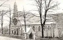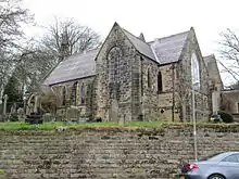 The foundation stone of this church was laid on 25 July 1868 by Rev. Charles Musgrave,[94] and it was consecrated on 25 February 1870.[95][96] It had two 1871 stained glass windows by Edward Burne-Jones and other windows by Dante Gabriel Rossetti and Ford Madox Brown. The remains of these windows are now at Cliffe Castle Museum.[97] When opened it had a west window with heads of four evangelists and four prophets, a bell turret, a sedilia, lectern, chancel tiles, pulpit and font.[95] The building was demolished in the 1970s.[97][98][nb 5]