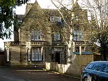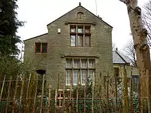 This is a Grade II listed building.[108] There is a picture of the building on its Images of England listing page.[109] It is situated near St Albans Presbytery off Dudwell Lane, Skircoat Green, Halifax, West Yorkshire HX3 0AT, and it was designed by Barber at a building cost of £2,300 in 1861, before Barber and Mallinson began their professional partnership.[110][111] It is a large, two-storey, gabled, detached house built in Gothic Revival style of coursed stone with ashlar dressings and bay windows. The left-hand chimney stack has a panel inscribed "1861." Inside, the stairway has "bulbous turned balusters and newels plus moulded hand rail."[109] It was later sold by the Church of England, and became Stafford Hall, then became a retirement home. As of 2010 it was under the control of Calderdale Council and had become dilapidated.[112][113] By 2014 the building had been renovated and had re-opened as a children's home.[114] There is no public access to the building.[nb 9]