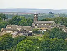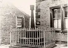 The Stainland Cross, on Stainland Road in Stainland, is a Grade II listed building.[140] It represents a saltier or St Andrew's cross, carved on a block of stone.[141] On 3 September 1875, The Building News published the following announcement: "The Stainland Board of Surveyors have given permission to have the ancient cross in Stainland restored according to plans by Mr Barber of Halifax."[142] In the twentieth century the Cross was moved to a position opposite Stainland Church. The railings in old images of the Cross in its previous position, were probably added by Barber.[nb 14]