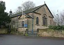 This is a Grade II listed building.[15] St John's in Windle Royd Lane, Warley, Halifax, was designed by Barber and built between 1877 and 1878.[15][152] This was a replacement for a wooden church built in 1856 in Windle Royd Lane further uphill. It was designed in Gothic Revival style for a congregation of 320–342, built at a cost of £3,930–4,000 with a church grant of £240 and consecrated in 1878.[153][154][155] The building was planned as a nave and chancel, with everything else to the south: the nave aisle, tower, vestry and organ chamber. It is built of locally quarried sandstone with grey freestone dressings. The tower, notable for its large pinnacles, is attached to the north-west corner of the nave, with a square turret housing a spiral tower staircase to the bell-ringers' chamber only, this turret being tucked between the spire and the nave. The tower's ground floor is the church entrance, and the clock mechanism and clock faces between the ringers' chamber and the belfry were added in 1905. The chancel has an open wagon roof and the nave has closely spaced rafters. Due to the 2005 interior re-ordering, there is little left of Barber's designed and commissioned furnishings, but his floors may still exist, concealed beneath carpeting. There is an octagonal font and a round stone pulpit with "open arcading and fleurons" which may possibly be to his original 1877 design. The reason for listing is given as the exterior architecture by Barber as a local architect, and the church's position in the landscape.[15][nb 17]