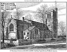 This is a Grade II listed building in Wakefield Road, Lightcliffe, West Yorkshire.[10] Barber designed this church as a replacement for Lightcliffe Old Church, of which the tower remains on another site.[131] The foundation stone was laid on Tuesday 16 September 1873, when the crane supports broke, causing injuries to several people.[132] It was consecrated by the Bishop of Ripon on 22 September 1875. It cost £15,000 to build, and has a 98 feet (30 m) tower including the 8 feet (2.4 m) turret. The nave is 71 feet (22 m) long by 22 feet (6.7 m) wide, with aisles of 10 feet (3.0 m) wide.[133][134] It has a Caen stone pulpit carved by John Birnie Philip, who also carved the reredos, and who created many works for George Gilbert Scott. James Clinsty of Huddersfield carved the font cover, and Charles Mawer of Leeds carved the capitals and other stonework. The church originally had an 1874 pipe organ by Booth & Kirkland, but this was replaced in 1905 with an organ by W. Andrews. Harry Percy Jackson carved the Watkinson Chapel and stalls.[133][135][136][137][nb 12]
