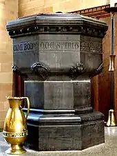 Barber reinstalled the original east window's stonework, and put in stained glass by Powell of Leeds.[157] A Caen stone credence table was built into the south wall of the chancel, there was new heating and gas lighting, and all windows had been replaced. Gill & Co. were the stonemasons. Items donated by the congregation were the altar cloth, altar rails and standards, alms dish and collecting bags, brass pulpit desk and lights, oak chairs, brass lectern and a new font carved by sculptor George Dyson of Crosland Moor.[14][158][nb 19]