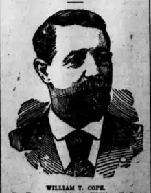 William T. Cope was born in 1836 at Columbiana County, Ohio, and in his earlier years was a coal operator or merchant. During the American Civil War he was a captain in the 143rd Volunteer Infantry.[2] He represented his county in the Ohio House of Representatives, winning elections in 1885 and 1887 to the 67th and 68th General Assemblies.[3]
