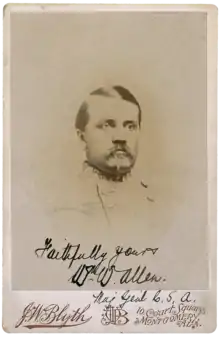 After Alabama declared secession, Allen enlisted in the newly raised Confederate States Army and was elected as a lieutenant in Company A, Montgomery Mounted Rifles. The following year, when the state organized the 1st Alabama Cavalry, Allen became its first major on March 18, 1862. He saw action at the Battle of Shiloh in April along the Tennessee River. He was subsequently promoted to colonel of the regiment before the Kentucky Campaign and led the 1st Alabama Cavalry at the Battle of Perryville, where he received a slight wound.[3] Later that year, he was severely wounded in the Battle of Murfreesboro while in command of a brigade.[3][4]