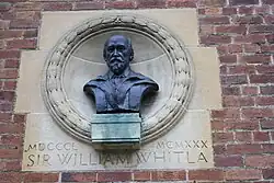 During Whitla's lifetime his gifts to his profession included the Good Samaritan stained glass window (commemorating the heroic behaviour of two Ulster doctors) erected in the Royal Hospital, and a building to house the Ulster Medical Society. At his death Lennoxvale was bequeathed to Queen's University as a residence for the Vice-Chancellor. The university also was his residuary legatee, and acted on his suggestion that the available funds should provide an assembly hall. The Sir William Whitla Hall was opened in 1949,[2] and now bears a plaque commemorating him.