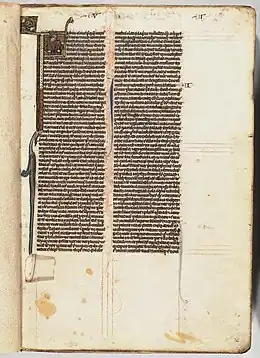 • A Bible whose surviving fragments are dispersed among several collections: the chief surviving portion (155 folios) is Lewis Ms E 29 in the Free Library of Philadelphia, 182 x 113 mm, with many historiated initials.[17] Fourteen leaves from this manuscript are now in the Lilly Library at Indiana University as Ricketts C:1 (1 leaf), Ricketts III:25 (1 leaf), and Ricketts III: 53 (12 leaves). Other leaves from this same manuscript are dispersed in private collections in England.