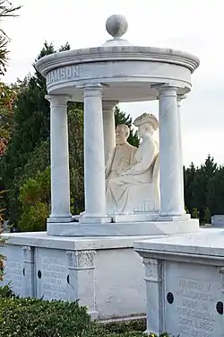 On August 17, 1912, Williamson had a twin mausoleum and columned canopy, built from Georgia marble, erected at the cemetery. Under the canopy above the mausoleum is life-size statuary depicting A. G., his wife, Martha J. Buchan Williamson, and their nephew, Jay Gould Williamson. The statuary was sculpted from Italian marble in Carrara, Italy, based on a family photograph.
