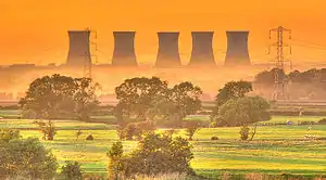 The output from the Willington Power Stations was fed into the 132,000 volt grid system (Nos. 1, 3 and 4 Units). Over these two transmission systems power was delivered to the surrounding area, and to a large extent to the South of England for use in the areas of Greater London and Bristol. The stations were privatised and sold to National Power in the early 1990s. Willington A closed in May 1995 and the B Station followed in 1999.[2] Although most of the stations were demolished at the turn of the millennium, the five cooling towers continue to dominate the skyline of the local area.[4] The site was earmarked for a large residential development, but the application was rejected and in 2011 permission was granted for a new power station to be built on the site.[5][6]