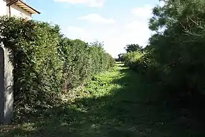The stationmaster's house from the original Willoughby station has survived, as have the brick goods shed and loading dock which are in industrial use.[6] Very little remains of the second Willoughby station and the aid of a map is necessary to find it.[16] The remains of the down main platform are visible from what is now a ploughed field; on the platform may be seen two concrete posts which supported the station running in board.[17] It is still possible to access the trackbed between the platforms and one gate from the level crossing survives on the south side of the line next to the stationmaster's house which is a private residence.[10] The footbridge was dismantled and now spans a fishing pond at nearby Burgh Le Marsh.[10] Approximately one mile of the former Mablethorpe branch line from the station site at Willoughby has been converted into a nature reserve and footpath.[18]